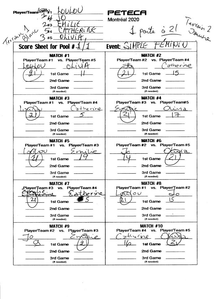 Il y avait 5 compétitrices au départ du volet de simple féminin et Émilie Terrine était pré-classée au troisième rang, tandis que Louise Mc Donald était première favorite. Au terme d’un long pool de 5, Louise et Émilie se sont retrouvées en finale. Louise l’avait emporté, difficilement par 21-19 dans les matchs de poule mais Émilie lui a servi une recette bien différente en l’emportant facilement en finale par 25-17.